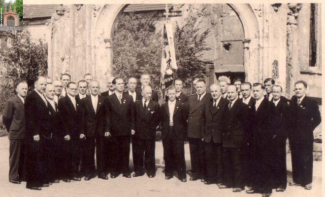 Wie am Zustand des Tores und den Resten des Klosters im Hintergrund unschwer zu erkennen, entstand dieses Foto in den Fünfzigern. In der Mitte vor der Fahne steht Bernhard Rausch, der 2. von rechts ist sein Vater Ludwig. Der 4. von rechts ist der langjährige (später Ehren-) Dirigent August Fischer. In der vorderen Reihe der zweite nach links von Bernhard Rausch aus ist Nikolaus Wagner junior, der Vorsitzende von MGV und Kirmesgesellschaft.